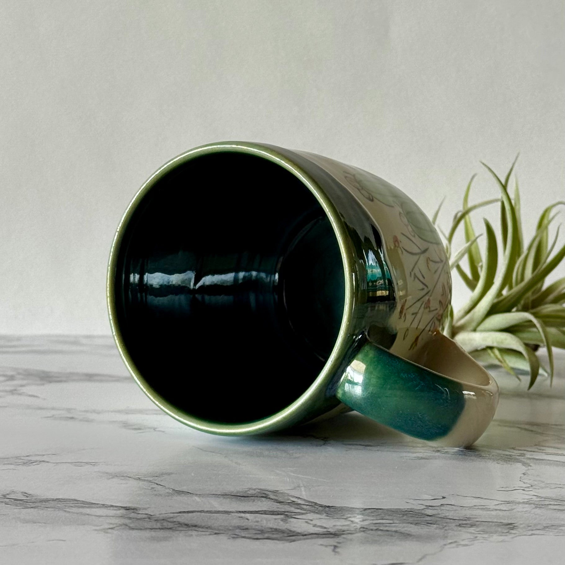 Wheel-thrown mug with a hand carved and painted cactus design on the outside and a moody, iridescent green and teal glaze on the inside that flows over the outer rim. Perfect for coffee, tea, hot chocolate, or anything you’d like!