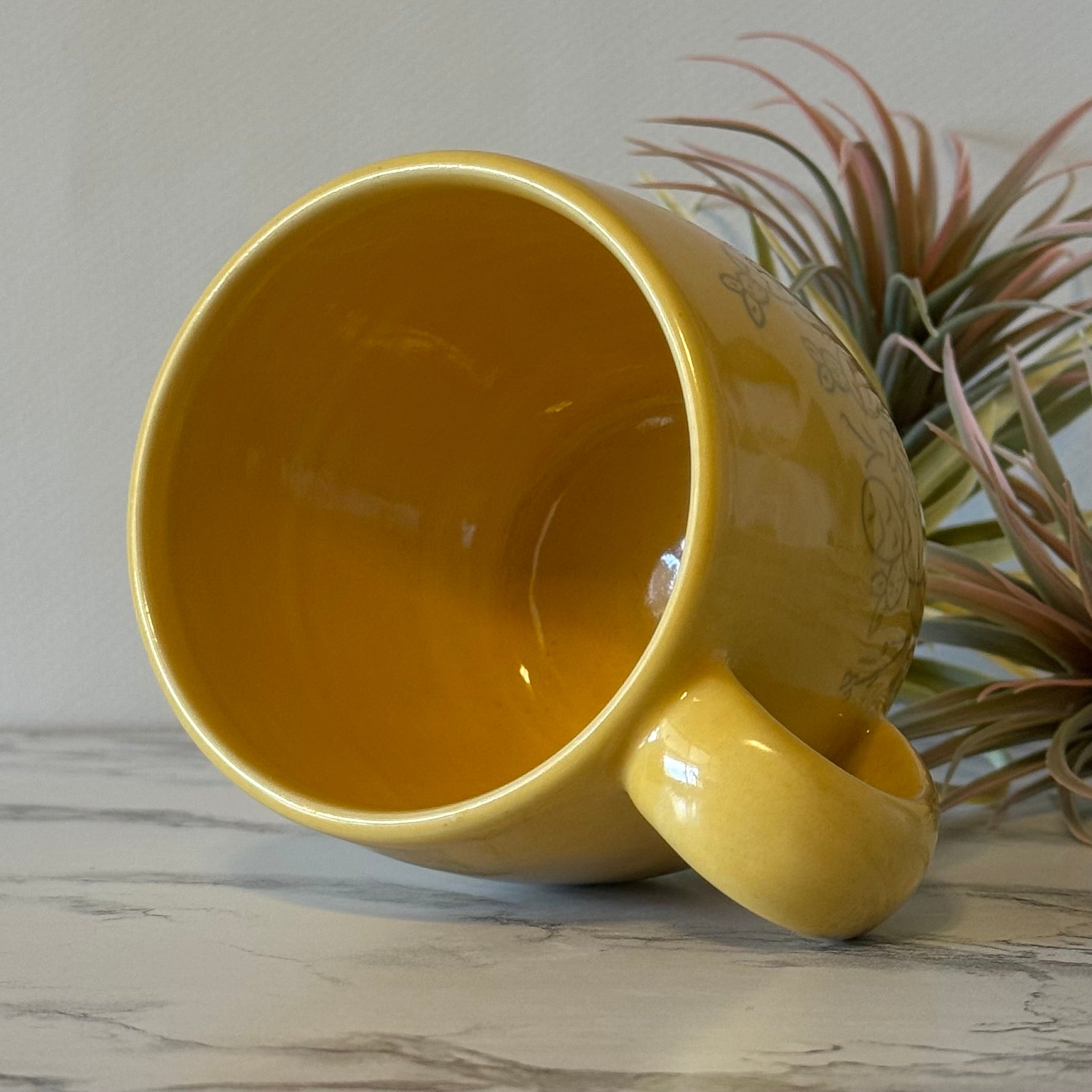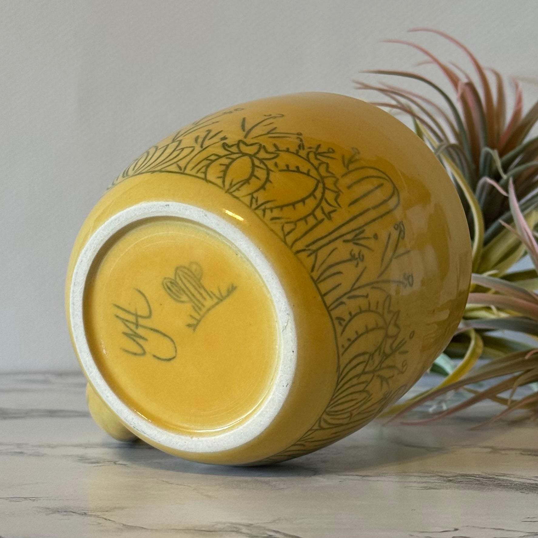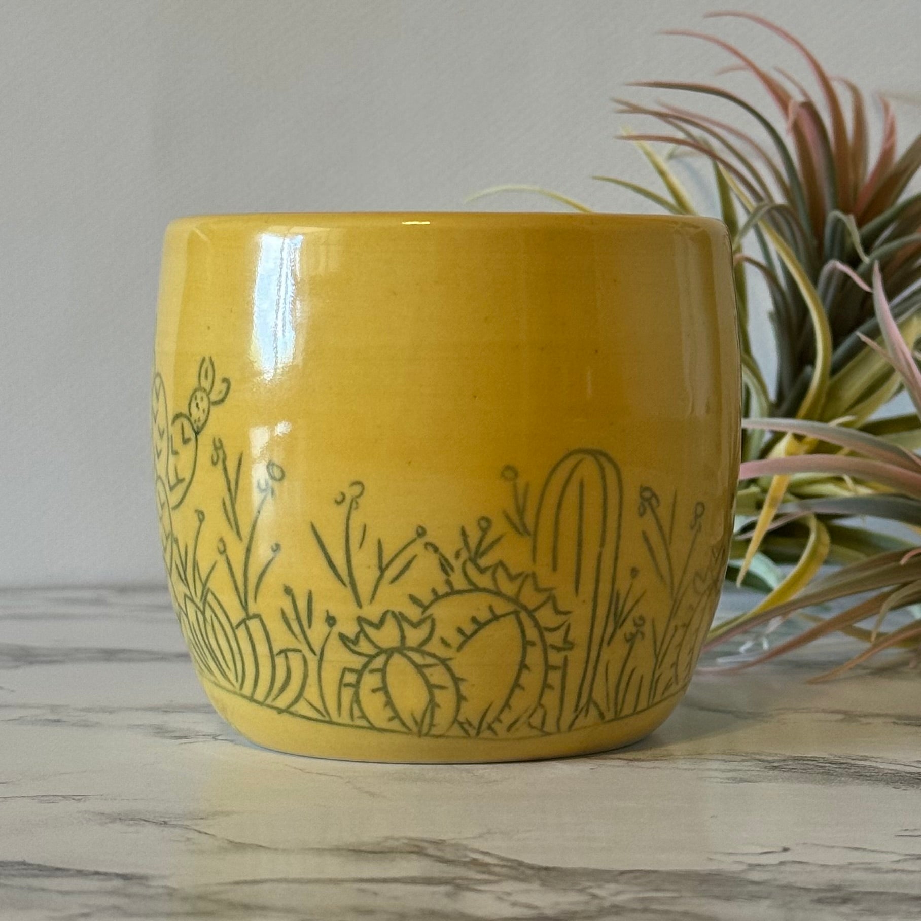 Wheel-thrown mug with a hand carved cactus design on the outside, glazed in a sunny two-tone yellow. Perfect for coffee, tea, hot chocolate, or anything you’d like!