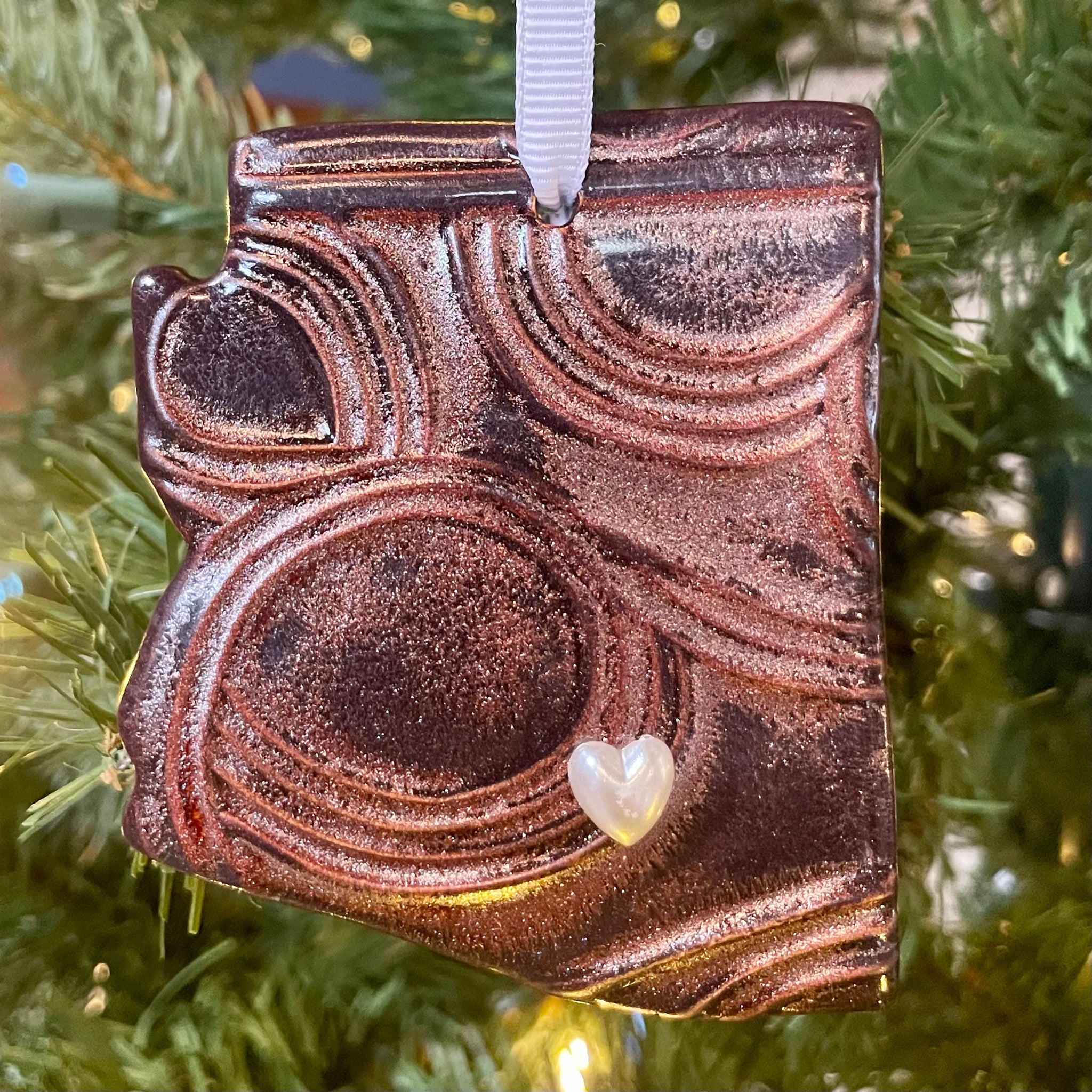 Just in time for Christmas! A "Signature Swirl" patterned Arizona ornament with a perfectly placed heart* to show your love for Tucson.