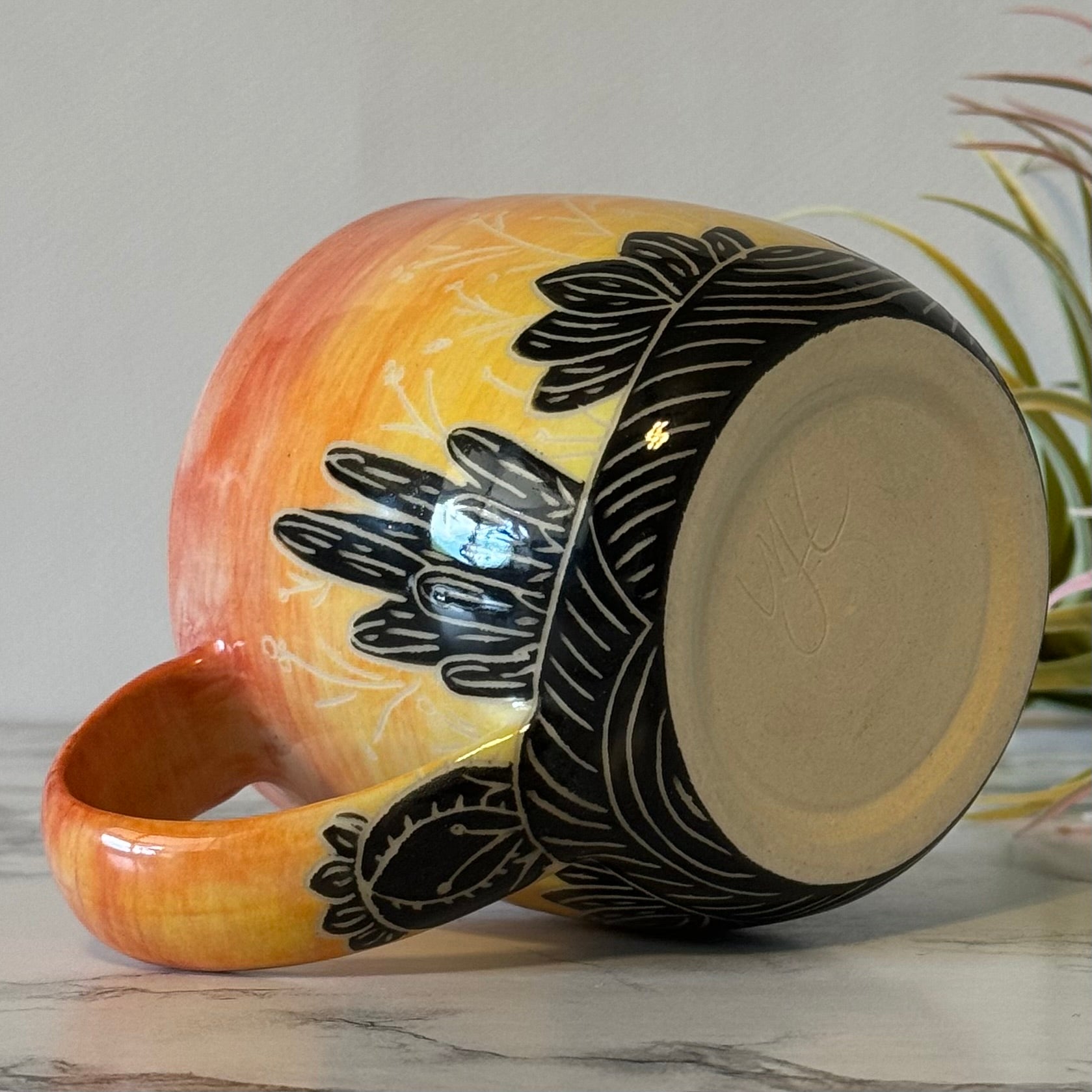 This wheel-thrown mug features a detailed sgraffito cactus design on an ombre sunset backdrop, with a sunny yellow glaze on the interior. Ideal for beverages such as cider, tea, and cocktails, plus much more. Also makes a great plant home!